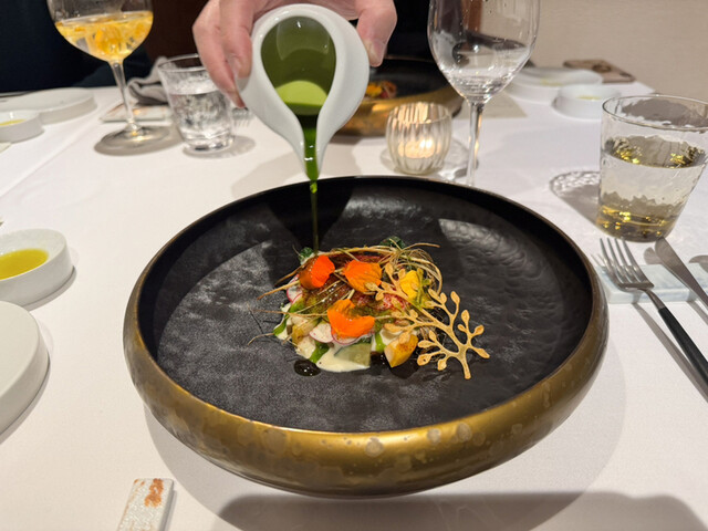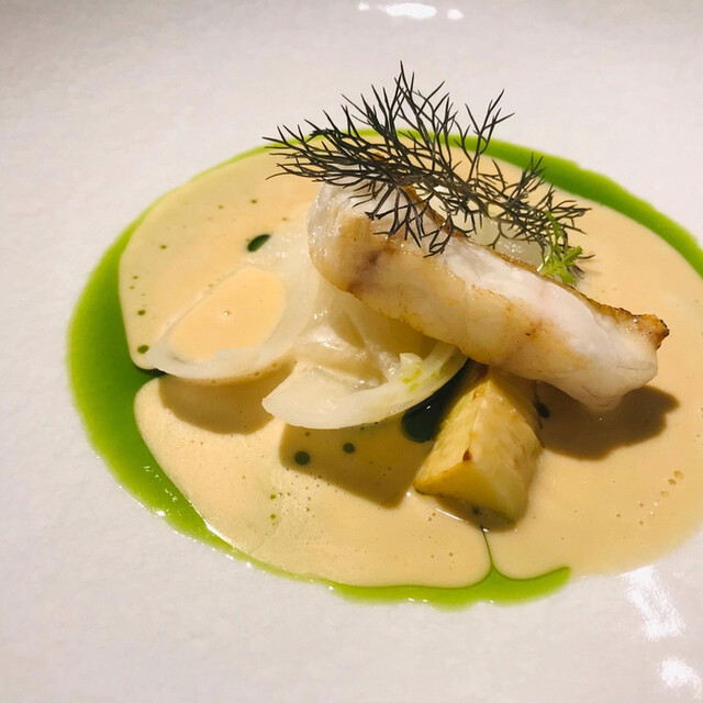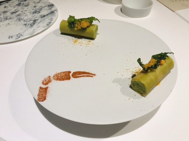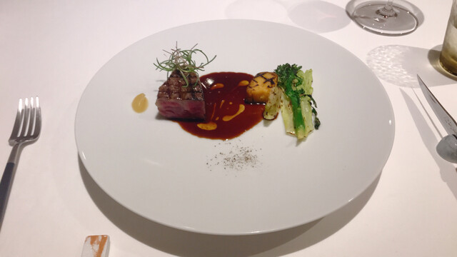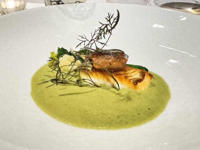 お魚はハタ。とても肉厚でプリッとした身の上にバリッとした皮がのっている。そして、オレンジ色の伊勢海老が入ったソースが下のグリーンのソースと合わさってメチャクチャ美味しかった!!