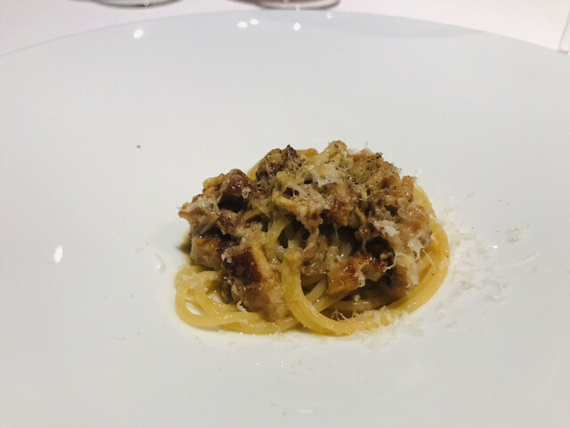 スパゲッティのアマトリチャーナは、神保シェフがいろいろ研究して解釈し直したとのことで、トマト、豚足、豚舌、チーズが素晴らしい形で溶け合っていて、絶品でした。