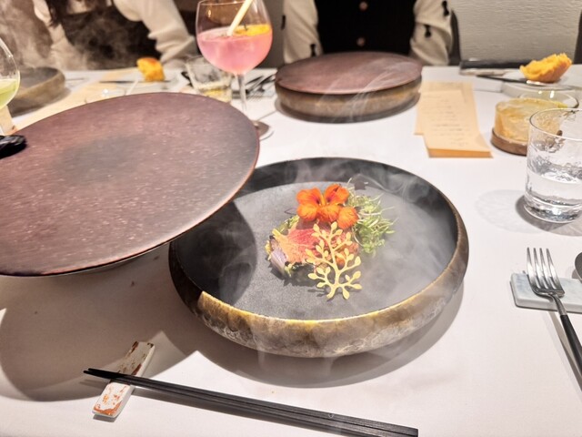 お皿の蓋を開けると、お野菜を燻したスモークがブワッと溢れてきて、美味しそうな香ばしい香りに包まれます。