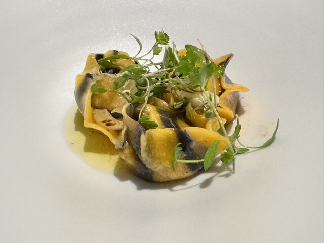 次に出てきたラビオリにはズキューンと撃たれました。なんと、中にナスが入っているのですが、本当に甘くて美味しくて、こんなナスの使い方は初めてで感動しました。