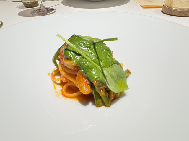紅ズワイガニのパスタ!カニの濃厚な香りと旨みに満たされて最高。横のグレーのペースト、蟹味噌かと思ったら全く苦味がなくなめらかでした。なんと、蟹味噌ではなく、赤茄子のピューレに魚醤が入っているとのことで、パスタのカニの旨味と合わさって、とてもマイルド。素晴らしいセンスに脱帽。