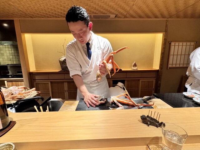 贅沢に大きな松葉蟹が3杯も捌かれて、目の前でお料理になる準備が完了。