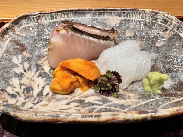 皮目を炭火焼きした鰆、イカ、雲丹。