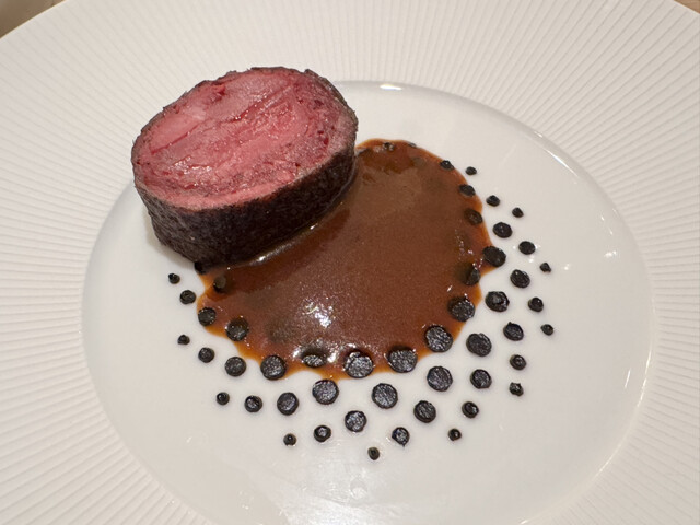 綺麗な赤身の円形のお肉が登場し、「これ鹿肉!?鴨をお願いしたはずだけど?」と思ったら、なんと、鴨のお料理!