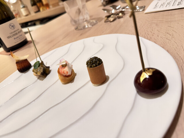 最初のアミューズは、真っ白なお皿に色とりどり5つも並んでいて綺麗。そして、旨い!