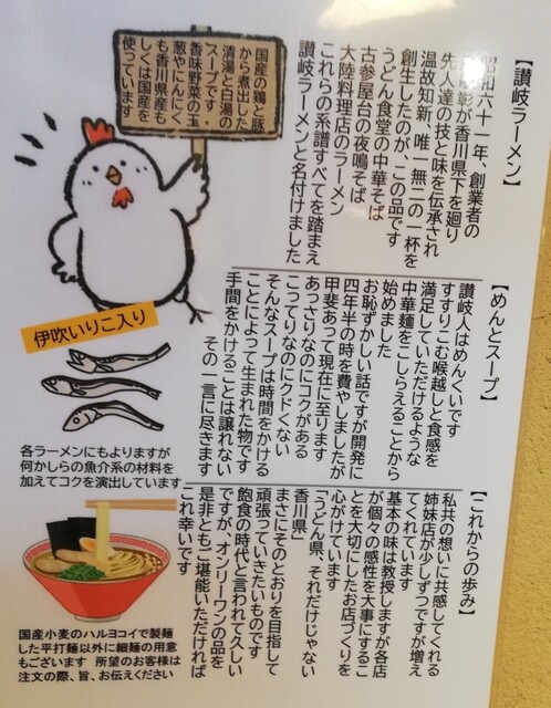 うどん王国にして、「讃岐ラーメン」の名を日本中に膾炙した超有名店! 「うどん」と「鳥坂まんじゅう」そして「旅情」とを共にお召し上がりください。