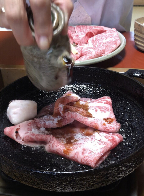 鍋に牛脂を溶かしてから手早く焼き、砂糖と醤油だけで味付けされたお肉