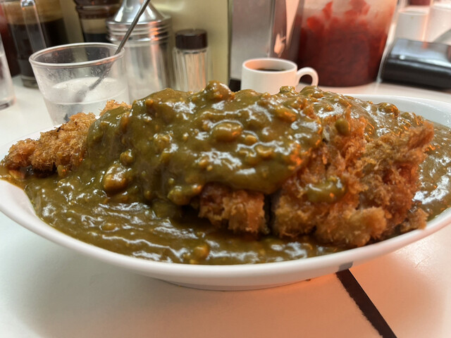 カツは薄切りの肉を使用しているが、カレーとの相性は抜群。カレーがこぼれないか心配だか、粘度が高いから安心。