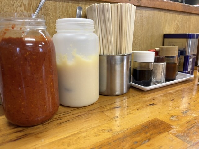 卓上のおろしニンニクと豆板醤、お酢を投入すれば、味変も楽しめる。