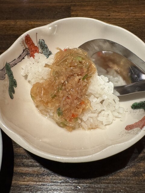 カミさんと久し振りのデートで来ました。頼んだのは、前菜5種盛り、飲茶3品、蟹と春雨の炒め、海鮮お焦げの4品です。前菜5種盛りは信じられませんが、作りたてのようで、クラゲはプリプリ、ピータンはネットリと濃厚な味、酔い鶏は火入れが上手いのでしょう、他店とは違う味わいです。搾菜と焼き豚も凄く新鮮。最初は生ビールで始めましたが、一緒に紹興酒を冷や(室温)で追加しました。飲茶3品は小籠包、海老餃子、シュウマイ全ていけます(特に海老餃子が美味い)。メインにした蟹と春雨炒めはボリュームも有って蟹の旨味を上手く引き出しています。海鮮お焦げは海老、イカがプリッとして餡と良く絡みます。