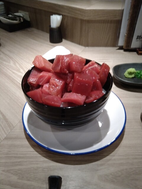 皆様の口コミを見てず〜っと機会を狙っていました。マグロちゃんの食べ放題、わぁ~~い。10:55にビル4Fに到着、ギョギョ?お店はEVの斜め前、左を見るとずらぁ〜っと奥に長い列、最後尾を目指して行くと階段を下がって続いている!3階フロアにてやっと最後尾到着。わあ、今日食べられるかしら?受付開始で列が少しづつ動き出しました。私の場合13:50スタートとのこと、因みに明日に出来るか聞いて見たところ当日のみとの事なので13:50でお願いしました。ワクワクしながら腹ペコリン13:40に再訪問、少しお店の前で待ちますとお店の方に名前を呼ばれます。カウンター席に案内され、皆が揃ったところでシステム説明とご飯をどんぶりにするかお茶碗にするかを聞かれます。どちらもおかわりOKで私はどんぶりでお願いしました。本日は宮城県釜石の本マグロ、もちろん生!カウンター越しにお玉でいいだけもってくれます。一杯、二杯、三杯、四杯、ここでアリガトウの一声でストップ。うわぁーーーマグロちゃんの団体さん、もりもりいくよー。先ずはそのままでパク、軽く漬け、醤油を付けて山葵とパク。おおっ、凄ウマ(*˘︶˘*).。*♡筋っぽくなく、赤身うまぁ〜。サイコロ状で食べやすいし中トロっぽいところもあり、クドくなくてたまらんです。ご飯も食べたいけど、少し抑えてマグロに取り組みます。お味噌汁も付きます、別皿に山葵と小葱と白菜の漬物がセットされています。刻み海苔もあります。ご飯を3分の2残してマグロリクエスト、大皿に残っていたのを全て頂きます。お玉三杯強位かしら?流石にご飯が無いと食べれないなぁ。因みに今までの最高はご飯ドンブリ6杯にマグロ8杯食べた細身の女性フードファイターだそうです。ア●ジェ●さんかしら?私はもう満腹でマグロ2回で終了、14:19にお会計しました。はぁ、しばらくマグロ食べなくてもいいかも。大変美味しいマグロでした。大大満足、ごちそう様でした!