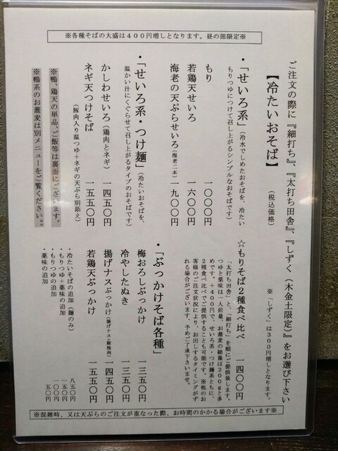 前から気になっていましたがなかなか入れずに…今日は表に人が並んでいません、もう売り切れた?恐る恐る戸を開けると、直ぐに入れます。きゃあーラッキー!二人掛け席に案内されます。素敵な店内、入って右手カウンター席、4人テーブル席と二人テーブル席。メニューから初めてだからもり蕎麦。2種盛りと迷って、細打ちのもりお願いします。ん、後ろにもカウンター席が有る!秘密の席みたいでいいなぁ。お蕎麦が来ましたよ。山葵と塩。汁は甘く無いけど辛くも無いけどすっきりと美味しい、普段甘系の汁が好きですが春のすけさんの汁、好きだわ。お蕎麦はきしっとした喉越しの良いお蕎麦。美味しい!流石!ああ〜、2種盛りにすれば良かった。次は何時来れるかな…