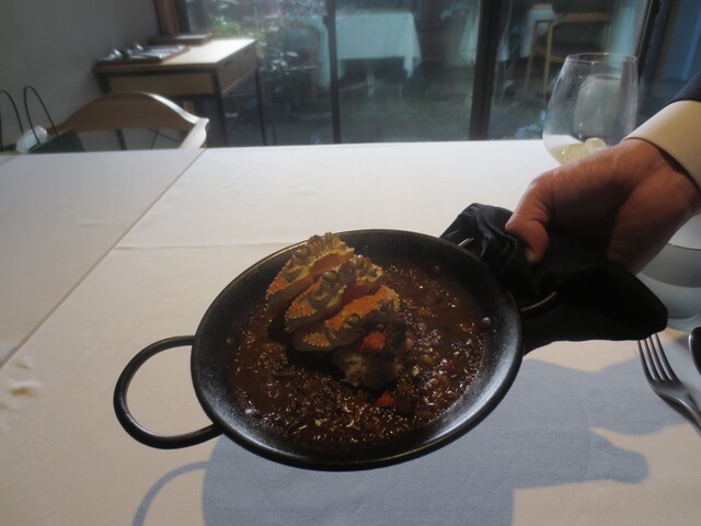 カニのリゾット、演出、私の顔が写ってなくてよかったです。背格好がわかっちゃいますね。