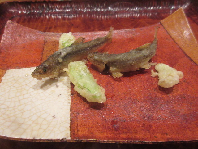 (4) 揚げ物:稚鮎(天竜川)米粉揚げ、鮎魚醤、蕗の薹