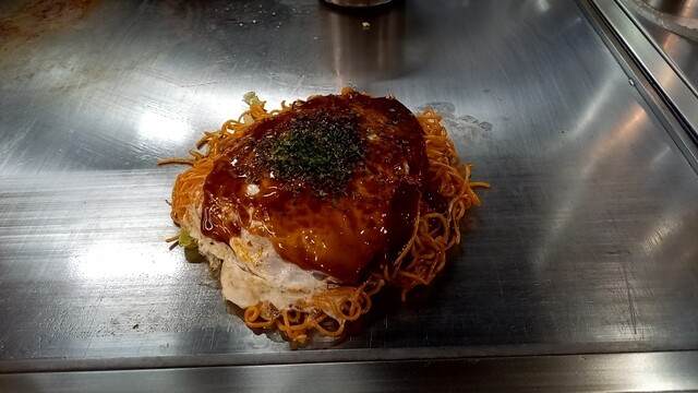 駅から離れた店を探すと、以前YouTubeで見たお好み焼き屋さんが。唐辛子麺のお好み焼きが動画に出て気になってました!