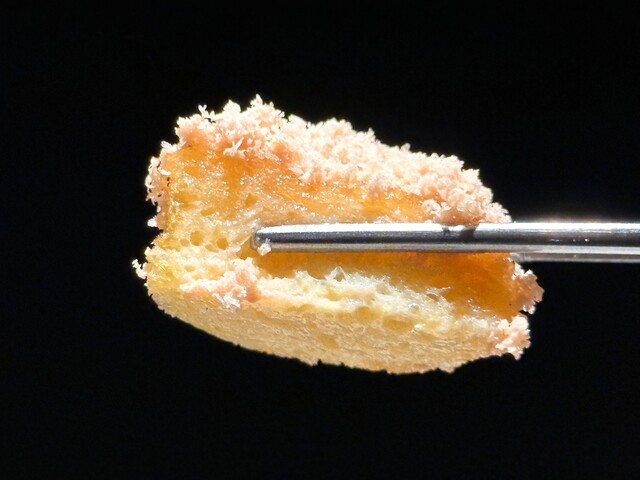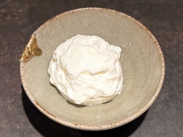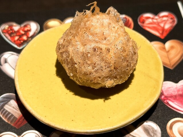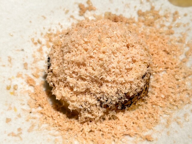 こちらはまずはじめにほんのり温かいミニサイズのフレンチトーストが提供され、そこに店主様が自ら-196℃の液体窒素で凍らせたフォアグラを目の前で削りかけてくれる演出付き