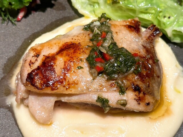 奥に葉で隠す様にして盛られたもも肉にはチミチュリソースがかけられており、爽やかな酸味とハーブの香りが脂の旨味と調和してコクの余韻が残り続ける味わい