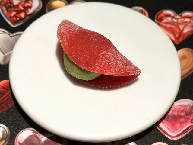 羽二重餅の皮部分がビーツで色付けされた見た目からも可愛らしさが感じられる一品