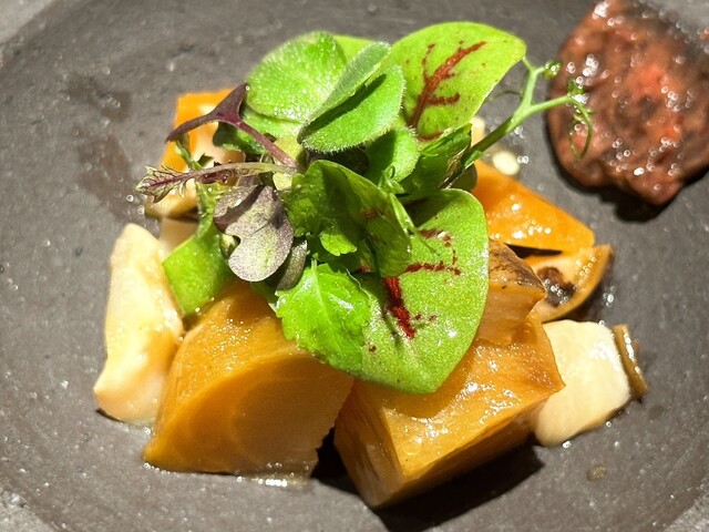 サザエの旨みやローストされた黄ビーツ・パッションフルーツの甘み、ハーブの香味が絶妙に口の中で重なり合う仕上がりでとても美味しかったです!