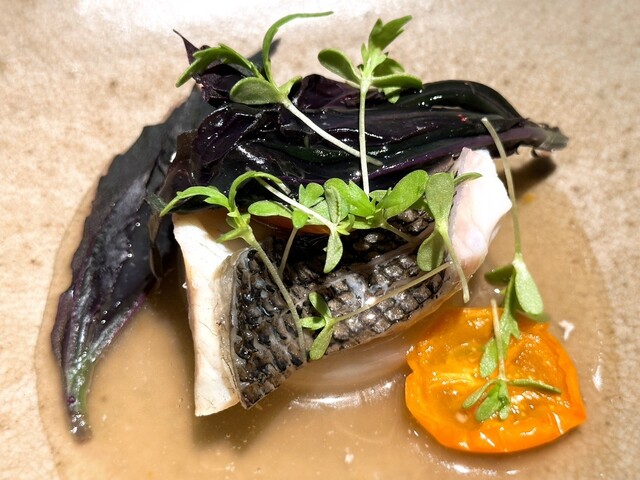 スズキは蒸し調理されていてふんわり柔らかな口当たりと上品に広がる旨味が印象的