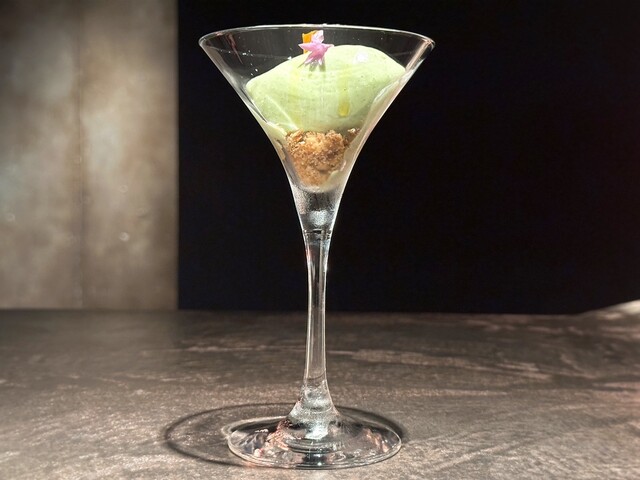 ワイングラスにサブレ生地と能登よもぎを主体としたアイスクリームが綺麗に盛り付けられての提供
