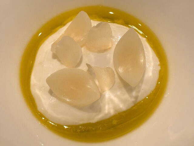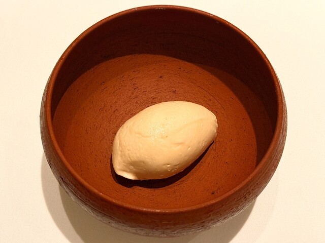 こちらはババロアの上にフランス/プロヴァンス地方のオリーブオイル、同じくフランス/ゲランドの塩、スライスマカデミアナッツ、ユリ根が乗せられた仕立てとなっており、全体を混ぜずにスプーンで掬って食べる形式となっていました