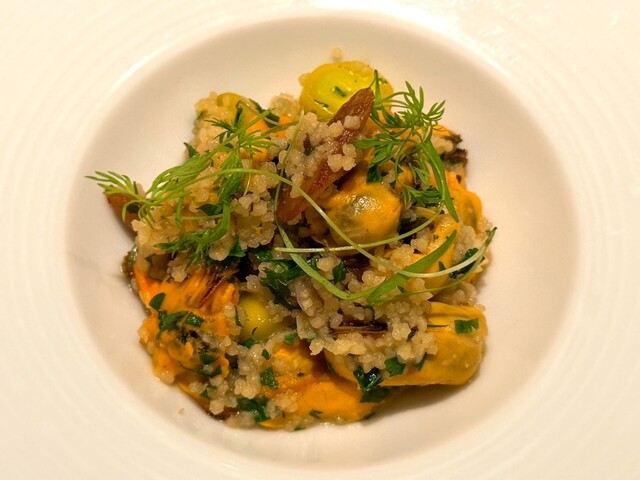 ムール貝とアフリカ発祥の伝統料理であるクスクス、天然の茸等を合わせた逸品料理