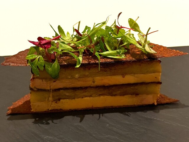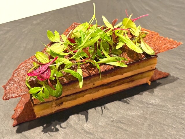 フォアグラ層・焼き茄子層がそれぞれ交互に2層ずつ積み上げられ、カカオを使用して作られたチュイールによってサンドされた逸品