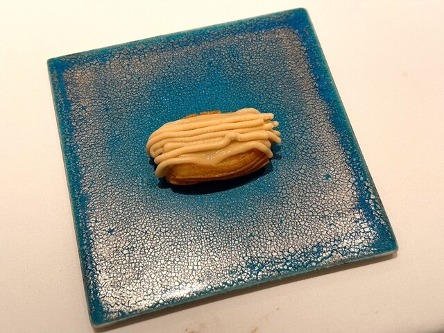 こちらは小さなサブレの上に完熟した万願寺唐辛子やメイチダイ、ゴボウチップス、芽ネギが乗せられており、小さいながらに色味のコントラストがしっかりしていて目が惹かれます