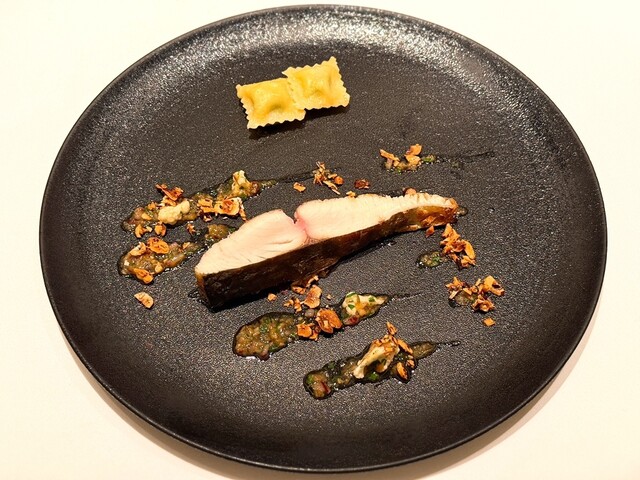 訪問時の魚料理には「鰆」が使用されており、横に枝豆を使ったラビオリが添えられ、ローストしたヘーゼルナッツ/カリフラワー等を使用したソースがかけられての提供でした