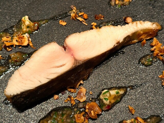 鰆は皮目がパリッと、身部分はオーブンでしっとりと仕上げられており、ナイフを入れると一切の隔て無くスッと入る所が印象的、技術の高さが光っていて素敵です