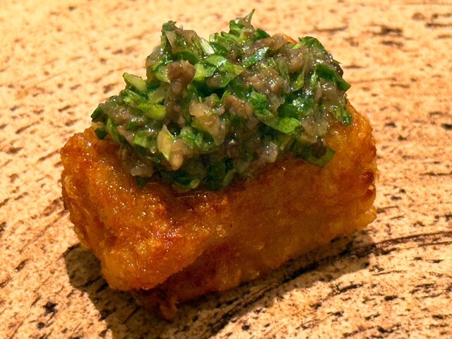 こちらは恵鴨と対比的にフリット由来の油の風味とコク、セルバチコの清涼感との掛け合わせが見事で、蓮根の自然な甘みとの調和も完璧すぎました
