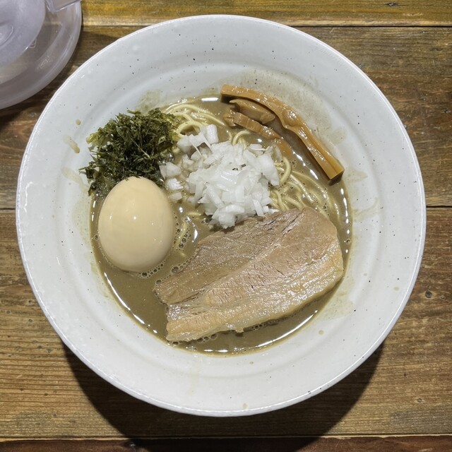 大量の煮干しを寸胴で煮詰めに煮詰めて、煮干のエキスを凝縮した超濃厚なスープに、大きくて分厚いチャーシューとメンマ、アオサ、刻み玉ねぎ、サービスの味玉がのっていました。
