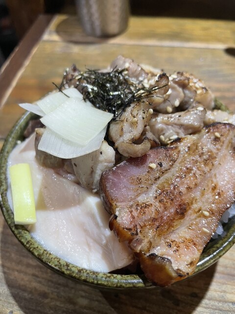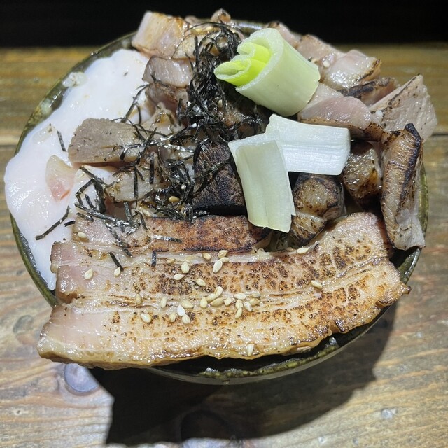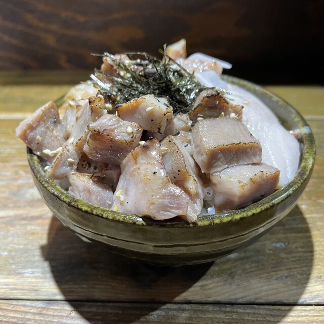 仕上げにバーナーで炙った3種の部位がのったチャーシューご飯も美味。
