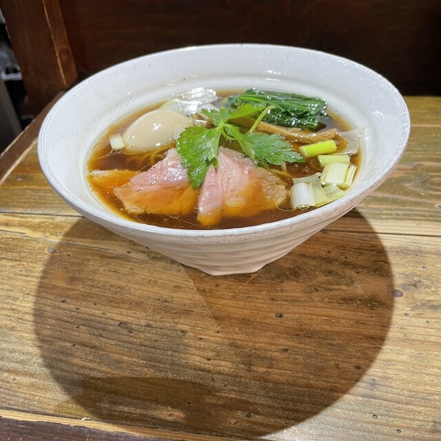 半透明の琥珀色のスープに、豚チャーシュー2枚、鶏むね肉のチャーシュー、メンマ、小松菜、三つ葉、ネギに、サービスの味玉がのっていました。