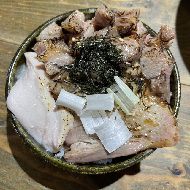 チャーシューご飯 は、小さな器のご飯の上に、こぼれんばかりにチャーシュー、刻みチャーシュー、鶏チャーシューを乗せて、バーナーで炙った後に、長ネギと刻み海苔をのせています。