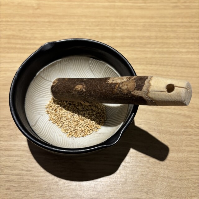 すぐにすり鉢に入った胡麻が提供されて、胡麻をすりすりしながら待つこと10分で着膳。
