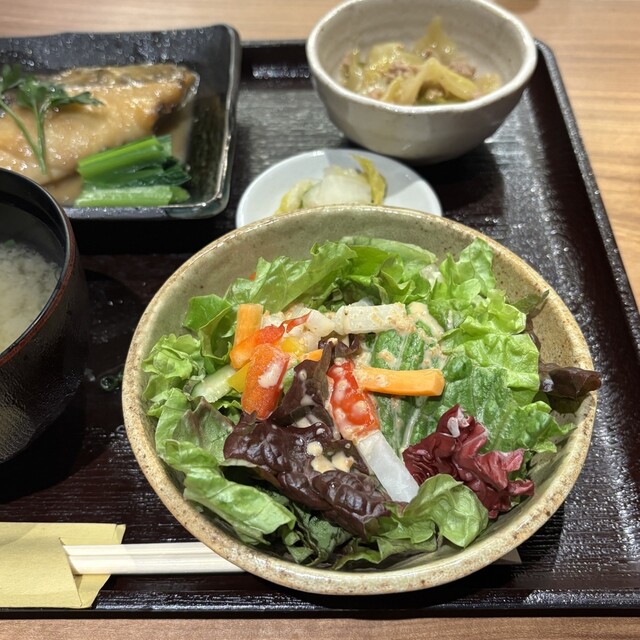 カウンター越しに手渡されたお盆には、鰆バター焼き、ご飯、味噌汁、サラダ、小鉢、香の物がのっていました。