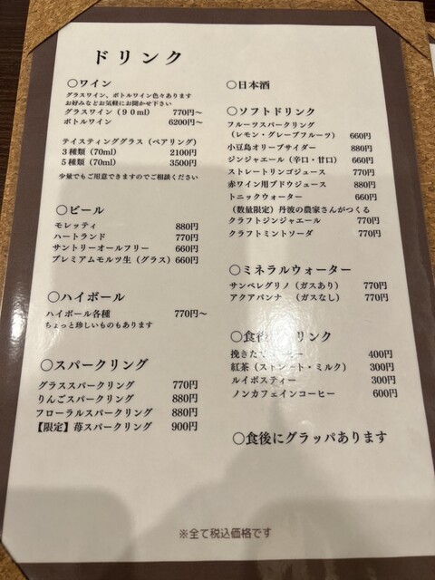 前日に予約して平日夕方18時すぎ頃に伺いました。18:30の予約だったのですが少し早めでも快く席に案内してもらえました。店員さんがコートを預かってくれ着席します。店内は白を基調としてライトも明るめ、席の間隔も余裕があって良い雰囲気です。