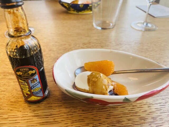 鎌倉のみかんにヨーグルトチーズアイスのデザート。お酒をちょっとふりかけて大人の味わいになります。おいしいデザートです(^.^)