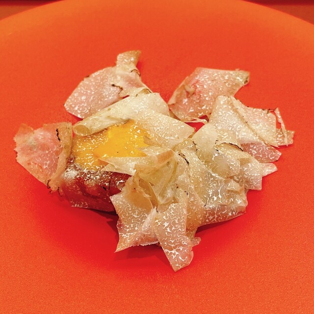 やま幸のマグロに、オータムトリュフが贅沢にふりかけられ、発酵塩漬けの黄卵と合わせ頂きました。