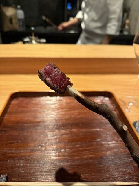 メインの延寿牛サーロインは、枝に刺さった状態で一口で頬張るスタイルで一切れ。この演出は面白かったです。初めて食べる延寿牛は、薪のほどよい低温でしっとり火入れされたのもあり柔らかく絶品です。“赤牛ならでは” の香りと旨みを、最も美味しい状態で差し出してくれます。百合根の炙りマッシュ、柚子胡椒味噌、バルサミコ生姜醤油、蓮根・根セロリ・銀杏と、付け合わせも香りの個性が際立ち最高のお肉でした。