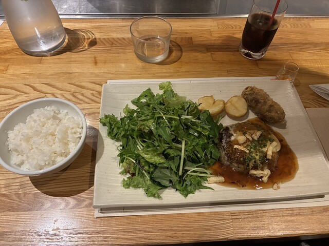 ジューシーな味わいの上に半熟卵でさらにインパクトを上げるハンバーグ
