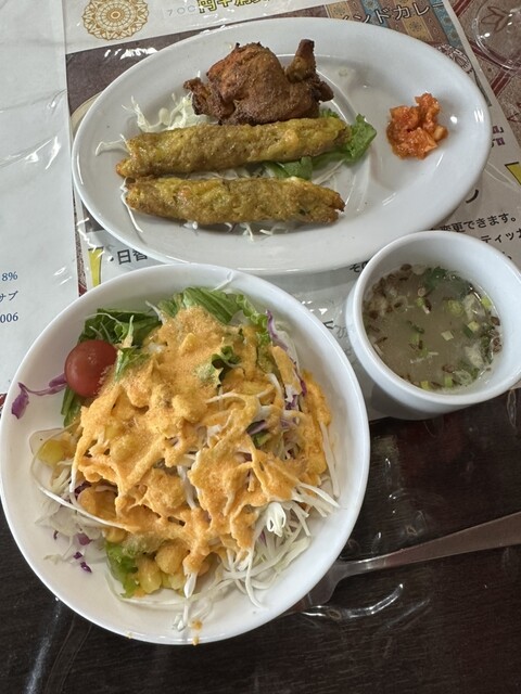 エビカレー・ポークサグカレー・スープ・ナン&小ライス・サラダ・パーパド・シークカバブ2本・チキンティッカ・選べるドリンクという超ボリューミーな内容。