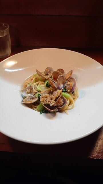 「ボンゴレビアンコパスタ」は、春が旬のアサリが惜しげもなくたっぷり入ってるし、色合いもよい青菜も入ってますw