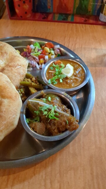 「A定食」はカチュンバル、パパド、アチャールとナンの生地を挙げたバトゥーラーに変更、それに茄子とオクラのカレーとレモン海老カレーをいただきました。