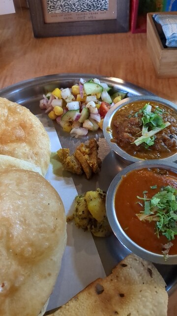 「A定食」はカチュンバル、パパド、アチャールとナンの生地を挙げたバトゥーラーに変更、それにをいただきました。