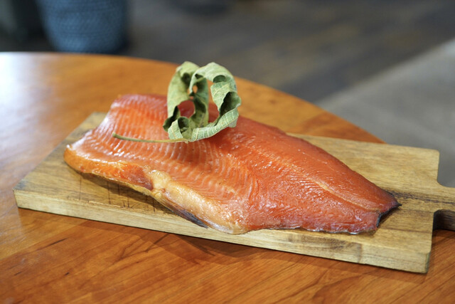 信州サーモンを20日以上熟成させ、水分が抜けて飴色になったところで、丸ごと火を入れて、中の柔らかい部分だけを取り出してきたと。