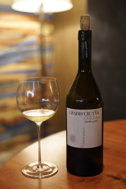 果実味のあるオレンジワイン。信州サーモンのスペシャリテに。