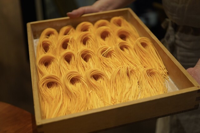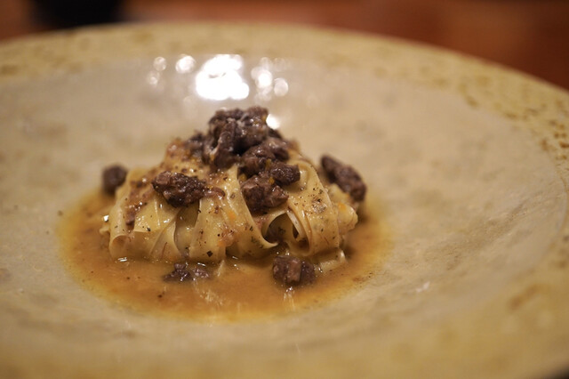 ローズマリーを練り込んだ、きしめんのように薄いパスタ。これに、2ヶ月半熟成した牛の脛肉のラグーソースを絡めていただきます。